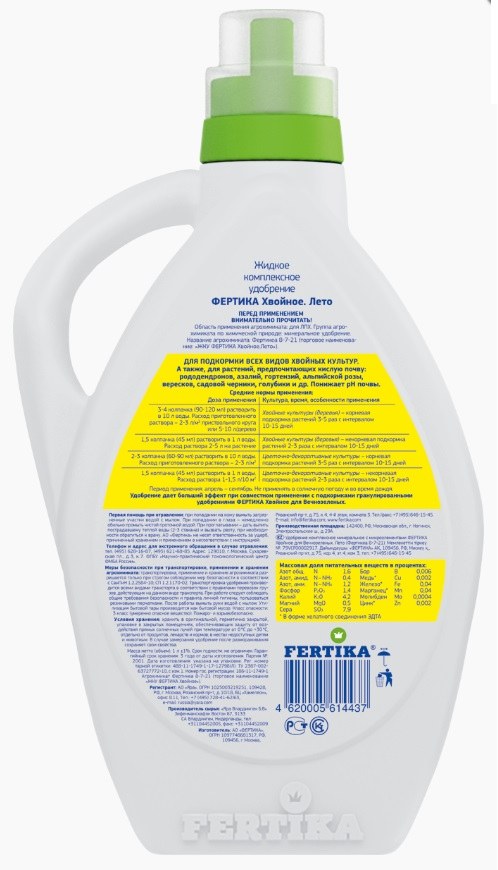 В отличие от гранулированных удобрений, жидкая форма Фертики действует быстрее и позволяет проводить внекорневые подкормки. Кроме того, состав точно адаптирован под потребности хвойных в тёплое время года, когда особенно важно поддерживать активный рост и здоровую окраску хвои.
