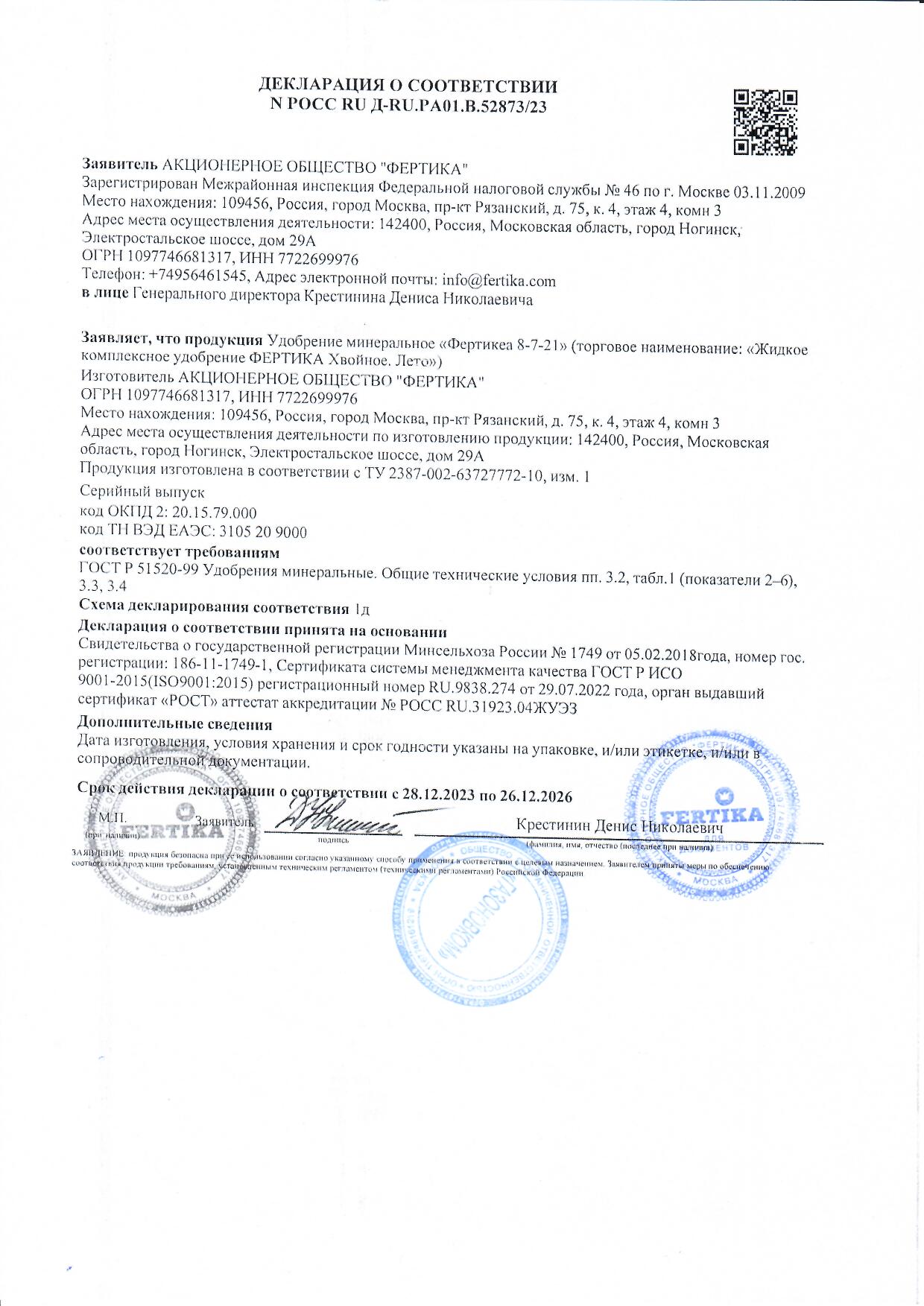 Жидкое удобрение Фертика для хвойных весна–лето — это полноценная подкормка в удобной форме, разработанная для активного роста и укрепления хвойных культур в тёплый сезон. Раствор быстро усваивается и обеспечивает растения всеми необходимыми веществами в период интенсивной вегетации.