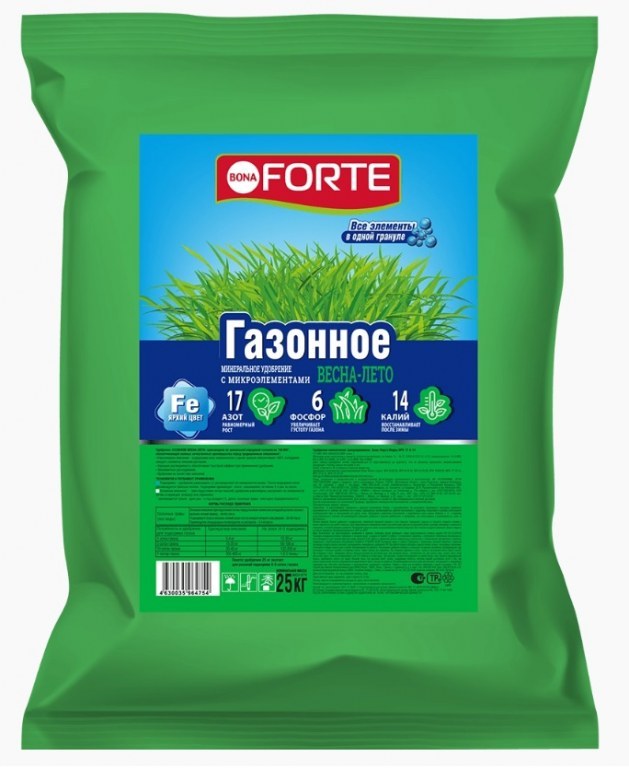 Когда возникает резонный вопрос, чем подкормить газонную траву, одним из оптимальных решений будет удобрение Бона Форте. Оно содержит основные макроэлементы питания азот, фосфор и калий NPK в составе 17:6:14, в легкоусвояемой и доступной форме для растений в сбалансированном соотношении с микроэлементами (молибден, цинк, железо, бор, медь, марганец), что способствует хорошему росту и развитию газонных трав.