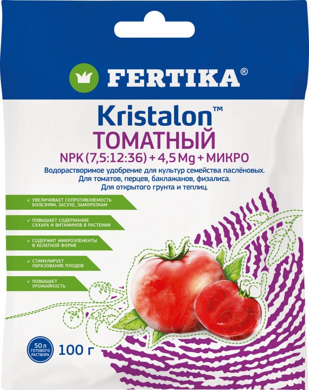 Кристалон томатный - полностью растворимое в воде удобрение для подкормки овощных культур из семейства Паслёновые. Получило широкое использование в открытом и защищенном (теплицы, парники, оранжереи, комнатное садоводство) грунтах. Применяется для повышения съедобных качеств плодов и увеличения урожая. Наиболее эффективно при соблюдении основных требований при выращивании (свет, тепло, вода) и регулярном грамотном уходе за растениями (своевременный полив, прополка от сорняков). Совместим со многими средствами защиты растений. Содержит базовые макроэлементы: азот, фосфор, калий, а также ряд микро: магний, сера, бром, медь, железо, марганец, молибден, цинк.